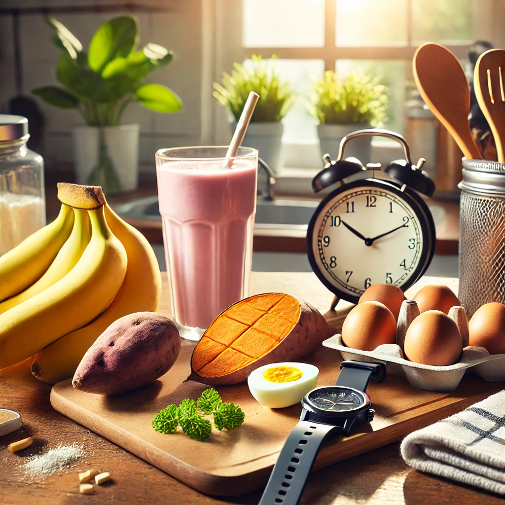 • 1시간 전: 소화가 빠른 탄수화물 중심 (바나나, 고구마, 에너지바 등)