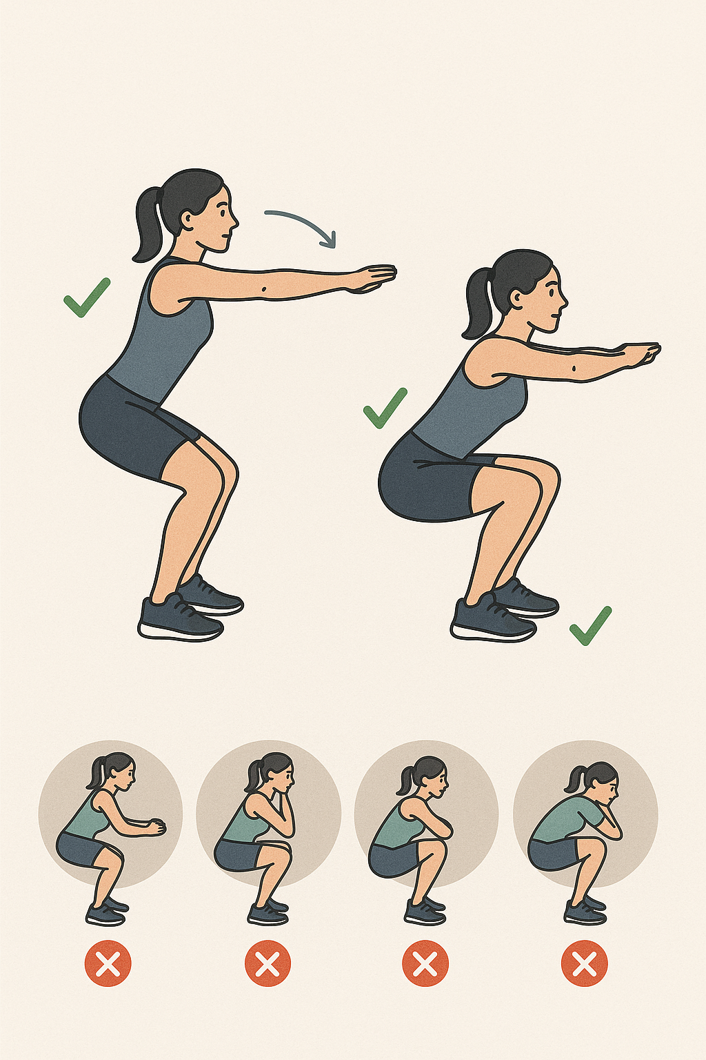 처음부터 깊게 앉으려고 하지 말고, 정확한 폼 유지에 집중하세요. 무릎이 불편한 경우는 깊이보다 무릎 정렬이 더 중요합니다.