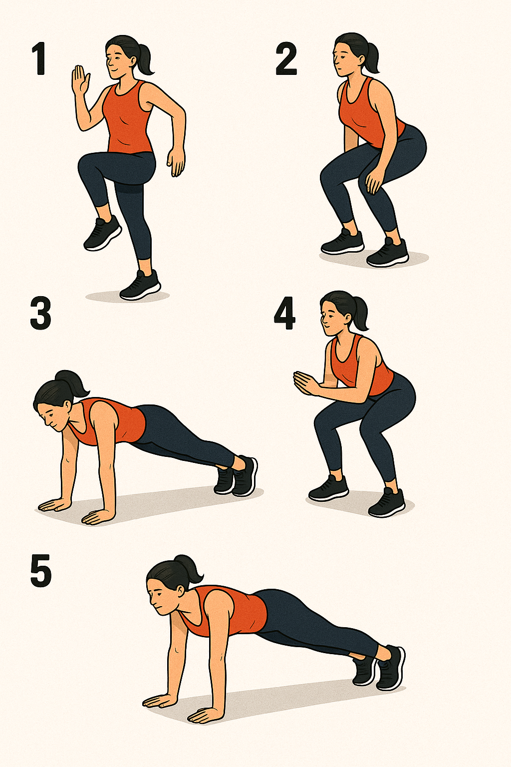 총 시간: 10분 구성: 각 동작 40초 운동 + 20초 휴식 1~2라운드 반복 (초보자는 1라운드만)